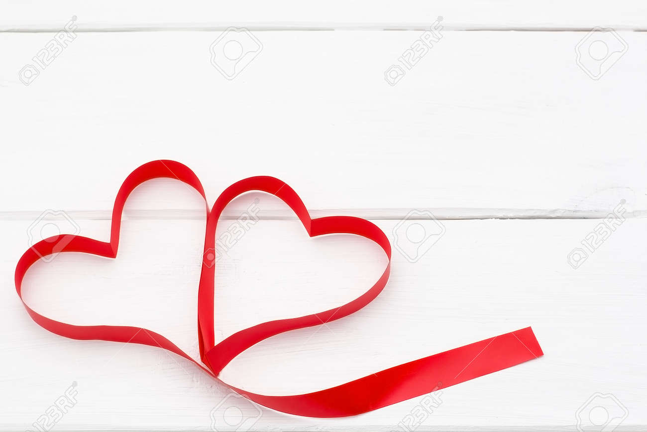 Red Hearts With Ribbon On White Wooden Background Romantic Love